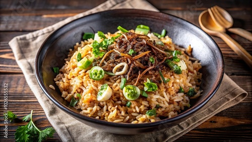 Delicious homemade fried rice with shallots and herbs served in a bowl on a rustic wooden table