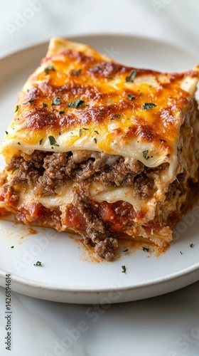 Delicious Homemade Lasagna Portion with Beef and Cheese on a Plate, Close Up