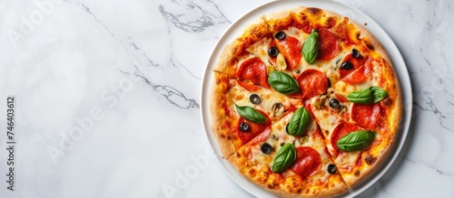 Delicious homemade pizza with green olives and fresh tomatoes on a white ceramic plate