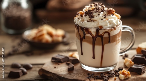 Delicious hot chocolate drink topped with whipped cream, chocolate shavings, and walnuts in a glass mug on wooden surface.