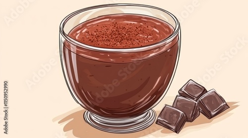 Delicious hot chocolate in a glass cup with chocolate squares.