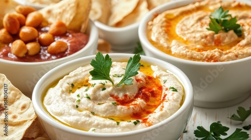 Delicious Hummus with Olive Oil and Spices Served with Chips