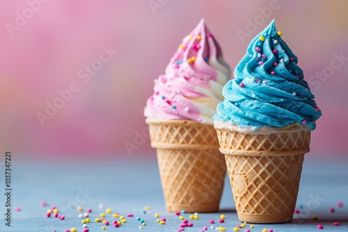 Delicious ice cream cones with pink and blue swirls topped with colorful sprinkles on a vibrant background