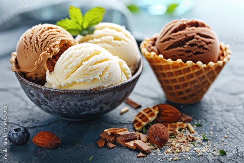 Delicious ice cream scoops in bowls with toppings and mint garnish.