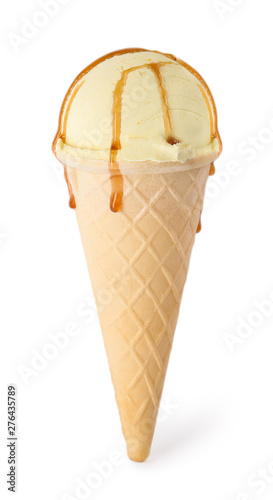 Delicious ice cream with caramel sauce in waffle cone on white background