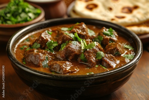 Delicious indian beef curry garnished with fresh coriander in a bowl