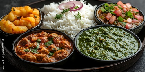Delicious Indian Cuisine Platter Featuring Chana Masala, Rice, Naan Bread, and Assorted Sauces