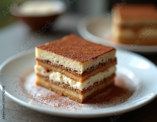 Delicious Italian tiramisu dessert served on white plate. Layers of coffee-soaked ladyfingers, mascarpone cream topped with cocoa powder. Close-up shot of sweet, creamy, coffee-flavored pastry treat.