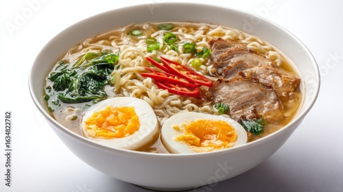 Delicious Japanese ramen bowl with sliced pork, red chili peppers, green onions and soft-boiled eggs in rich broth on white background
