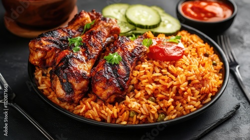Delicious Jollof Rice with Grilled Chicken garnished with fresh vegetables on a dark slate background for a vibrant culinary presentation.
