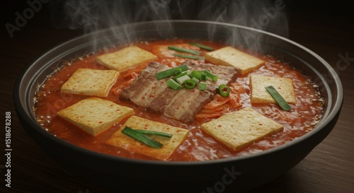 Delicious kimchi jjigae stew with tofu and pork belly hot soy red eat food meal dish soup meat warm