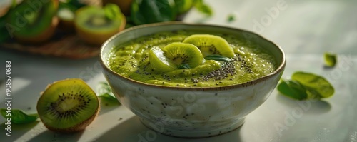 Delicious kiwi smoothie served in a bowl, garnished with fresh kiwi slices and mint leaves, perfect for a nutritious snack.