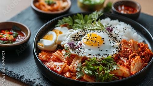 Delicious Korean dish featuring kimchi, rice, and fried egg, garnished with herbs and sesame seeds, served on black plate with side dishes