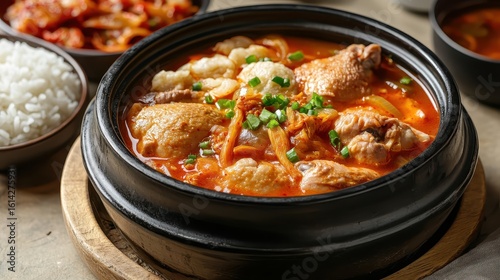 Delicious Korean Traditional Stew in Black Bowl with Ingredients
