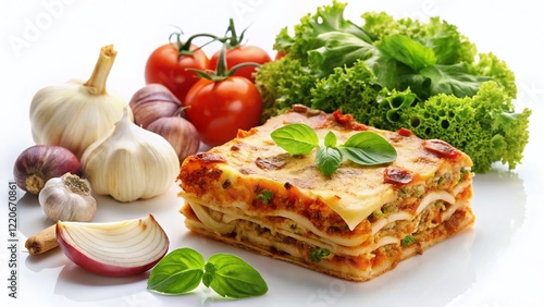 Delicious Lasagna Dinner: Studio Shot of Lasagna, Salad & Garlic Bread
