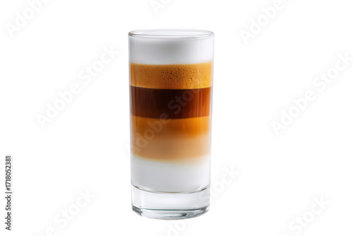 Delicious layered latte macchiato coffee beverage in a tall glass with a transparent background