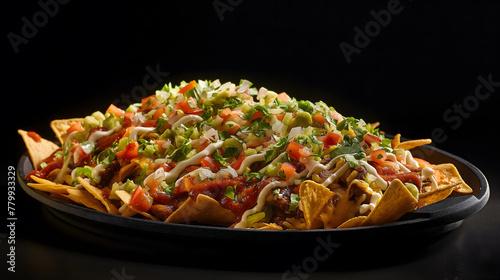 Delicious Loaded Nachos with Fresh Toppings on Dark Background