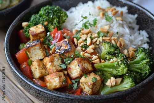 Delicious Low Carb Spicy Satay Tofu with Broccoli and Peanuts in a Savory Sauce