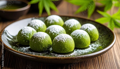 Delicious Matcha Mochi Sweets Powdered Green Tea Confections on a Plate