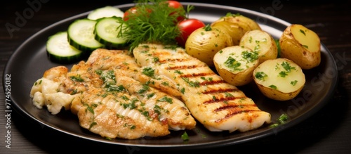 Delicious meal featuring succulent chicken, crispy potatoes, fresh cucumbers, and juicy tomatoes on a plate