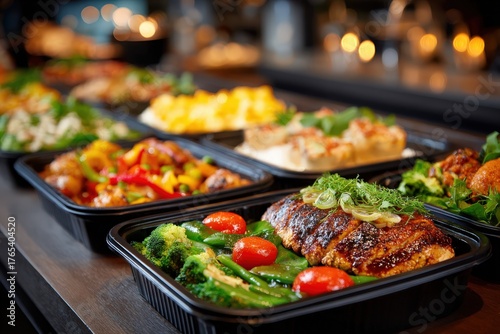 Delicious meal prep containers filled with grilled meat, vibrant vegetables, and colorful sides, beautifully arranged on a wooden table, showcasing healthy eating options and culinary artistry