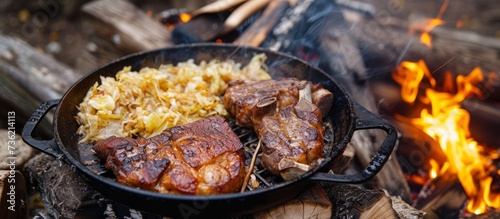 Delicious meat and rice cooking on a crackling campfire in the wilderness
