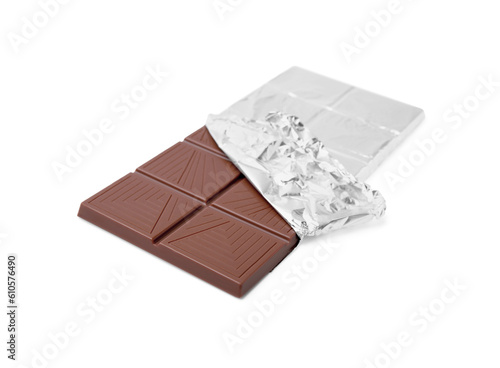 Delicious milk chocolate bar wrapped in foil isolated on white
