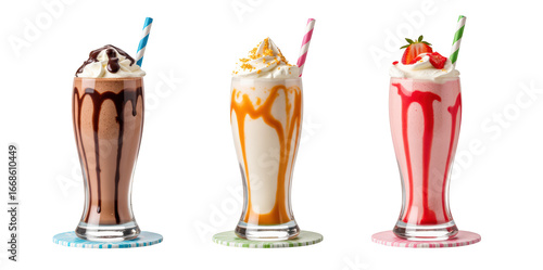 Delicious milkshakes in tall glasses, featuring chocolate, caramel, and strawberry flavors, topped with whipped cream and colorful straws