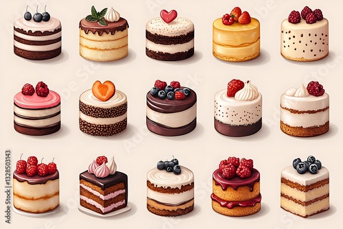 Delicious Mini Cakes Assorted Flavors & Toppings, Sweet Treats Illustration