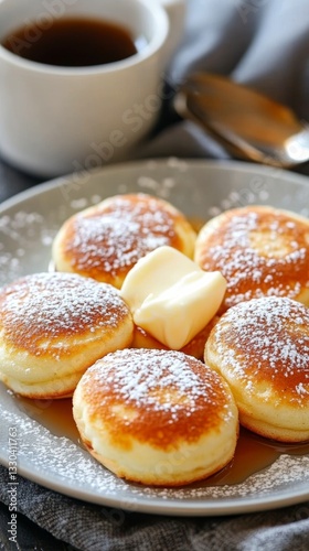 Delicious mini Dutch poffertjes served with butter and syrup in a cozy cafe setting