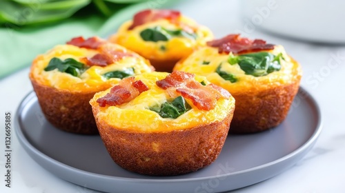 Delicious mini quiches with spinach and bacon, served on a gray plate, perfect for brunch or snack time.