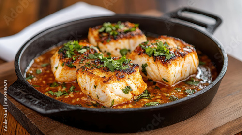Delicious monkfish fillets cooked in rich tomato broth, garnished with fresh herbs