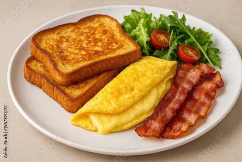 Delicious morning meal featuring French toast, fluffy omelette, and crispy bacon