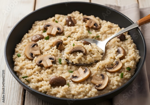 Delicious Mushroom Risotto in a Black Bowl with a Spoon, Closeup Food Photography.