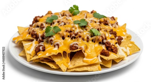 Delicious nachos with melted cheese, ground beef, and cilantro isolated on white background perfect for a party
