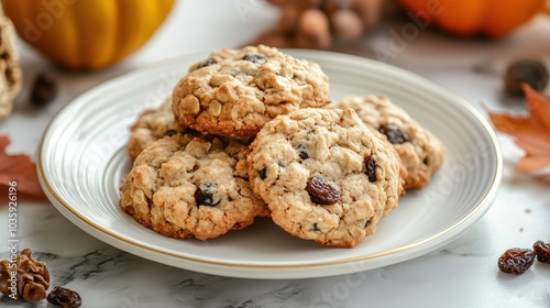 Delicious Oatmeal Cookies with Raisins on White Plate