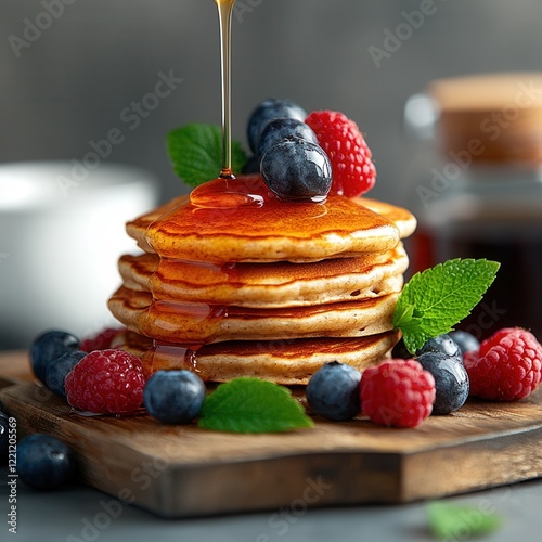 Delicious oatmeal pancakes with fresh berries and maple syrup for a cozy breakfast.