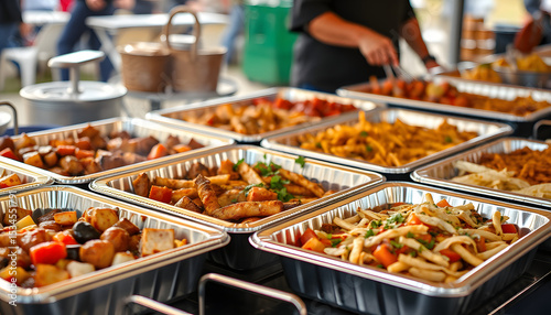 "Delicious outdoor Mexican fajita catering served in convenient aluminum trays.", cinematic. isolated with white highlights