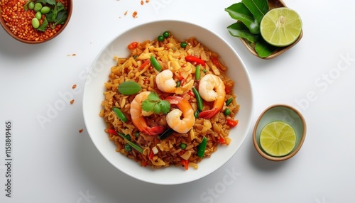 Delicious Pad Thai with Fried Rice and Shrimp Garnished with Lime and Fresh Herbs
