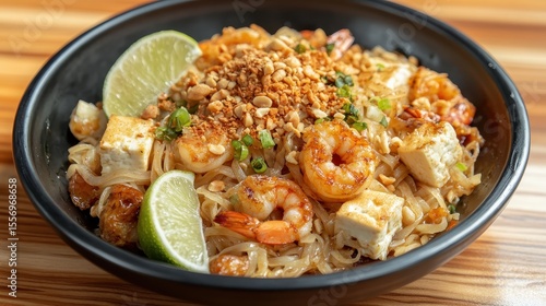 Delicious Pad Thai with Shrimp and Tofu Served in Black Bowl