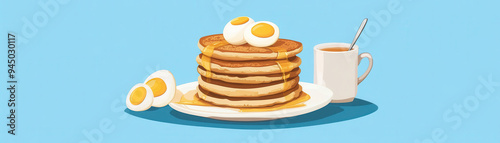 Delicious pancakes stacked high with eggs and syrup, accompanied by warm cup of coffee, evoke cozy breakfast feeling.