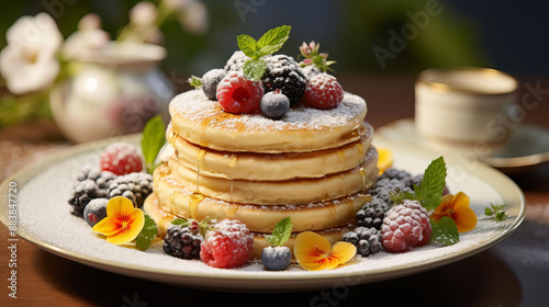 Delicious pancakes stacked with fresh berries, mint leaves, and dusted with powdered sugar on a plate.