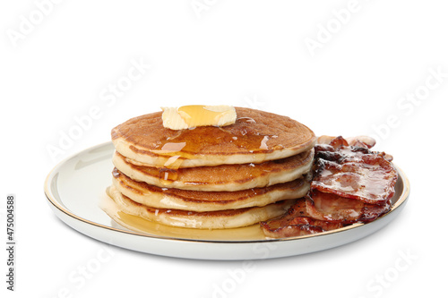 Delicious pancakes with maple syrup, butter and fried bacon on white background