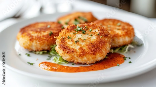 Delicious pan-fried crispy breaded spicy vegetable burger patties served with salad and red pepper sauce on a white plate