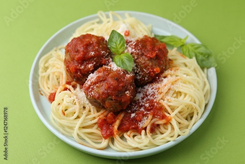 Delicious pasta with meatballs, basil and cheese on green table, closeup