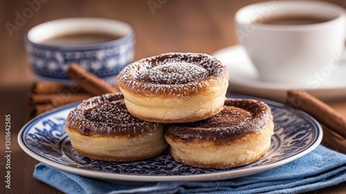 Delicious pastel de nata custard tarts served with espresso on a traditional blue-and-white ceramic plate in a cozy cafe setting