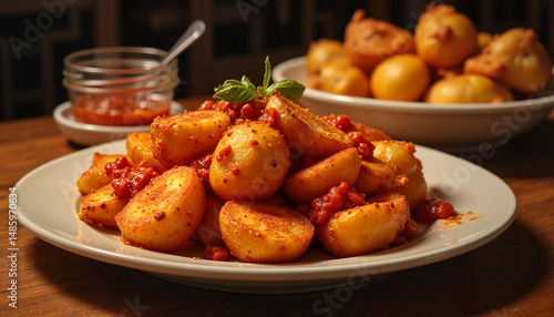 Delicious Patatas Bravas served with spicy sauce, cozy restaurant vibe