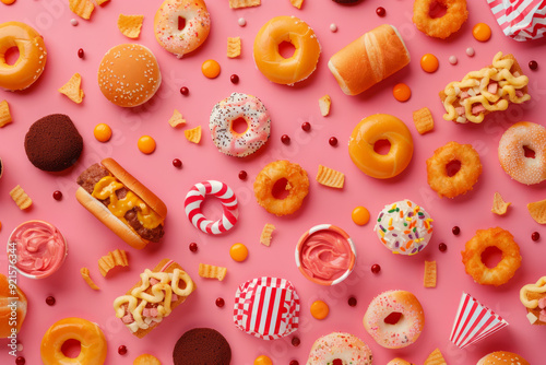 Delicious pattern with assortment of colorful sweets and pastries. Donuts, cupcakes, and cookies on bright background.