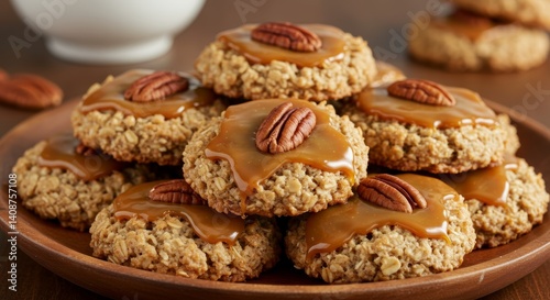 Delicious pecan pie cookies with caramel topping presented on wooden plate