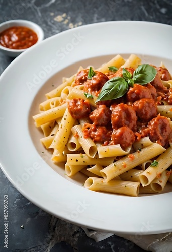 Delicious Penne Pasta with sausages, tomato sauce, parmesan cheese, basil and vegetables served